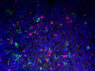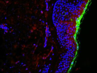 Immunofluorescence double staining kits are utilized to detect two antigens simultaneously, utilizing two distinct secondary antibodies derived from different host species, each conjugated with different fluorophores. This approach allows for the precise localization and visualization of both target antigens within a single section. In addition, the kit is paired with DAPI staining to visualize and count nuclei.