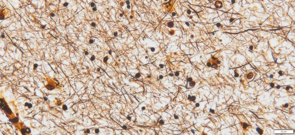Bielschowsky’s Silver Stain Kit is designed for the staining of nerve fibers and the detection of neurites and neurofibrillary tangles. Nerve fibers are sensitized with a silver solution. The sections are treated with ammonical silver, then reduced to visible metallic silver. Axons, neurofibrillary tangles and senile plaques will be stained black, and the background will be yellow to brown.