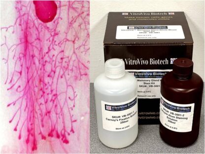 Wholemount staining of mouse mammary glands shows the structure of the whole gland and how it is altered in diseased states and in response to various hormones, or carcinogens. VitroView™ Mammary Gland Whole Mount Stain Kit is very useful for the study of mammary gland development.