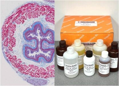 Masson’s Trichrome Stain Kit is used to differentiate between collagen and smooth muscle in tumors, and the increase of collagen in diseases such as cirrhosis. It is a routine stain for liver and kidney biopsies. This kit can be used for FFPE and frozen tissue slides.