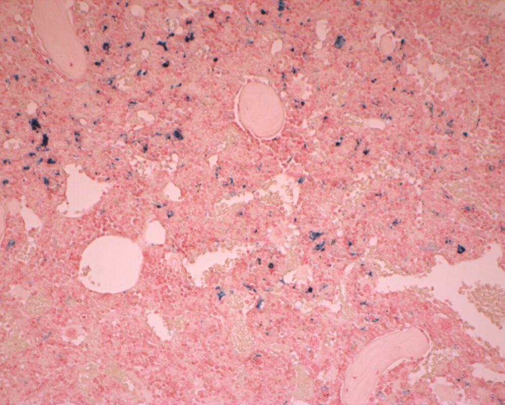 Prussian blue reaction involves the treatment of sections with acid solutions of ferrocyanides. Any ferric ion (+3) present in the tissue combines with the ferrocyanide and results in the formation of a bright blue pigment called Prussian blue. This is one of the most sensitive histochemical tests and will demonstrate even single granules of iron in blood cells. Small amounts of iron are found normally in spleen and bone marrow. Excessive amounts are present in hemochromatosis, with deposits found in the liver and pancreas, hemosiderosis, with deposits in the liver, spleen, and lymph nodes. This kit is designed for staining ferric iron in tissue sections.
