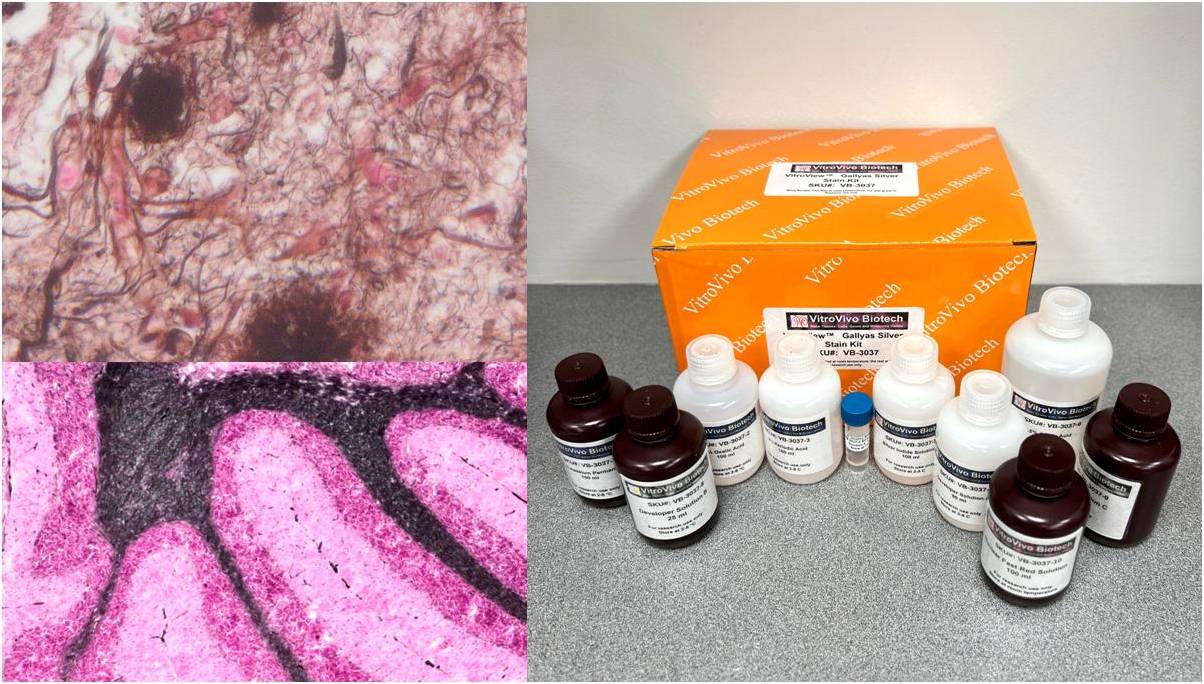 Gallyas silver stain is a specialized histological staining technique widely employed in neuroscience research to visualize pathological alterations, notably neurofibrillary tangles and senile plaques, prevalent in neurodegenerative conditions like Alzheimer’s disease. This staining approach selectively targets paired helical filaments, comprising hyperphosphorylated tau protein, facilitating their detection and microscopic examination. Renowned for its ability to provide high contrast and resolution, Gallyas silver stain serves as a pivotal tool in deciphering the intricate structures of the brain and elucidating the underlying mechanisms of diverse neurological disorders. The VitroView™ Gallyas Silver Stain Kit is a meticulously optimized staining kit specifically designed for identifying changes associated with neurofibrillary tangles and senile plaques within the brain.