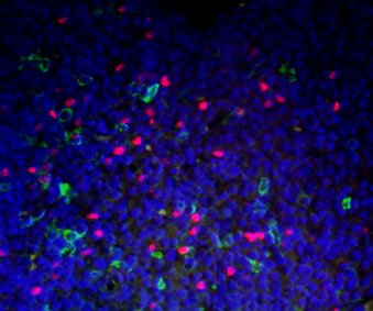 • Detection: Incubate sections with a mixture (70-150 µl) of two secondary antibodies raised in different species (with two fluorochromes including anti-Rat FL647 and anti-rabbit FL488 secondary antibodies) at appropriate dilutions (1/100-1/500) in 0.1% BSA in PBS for 1 hour at room temperature in the dark.