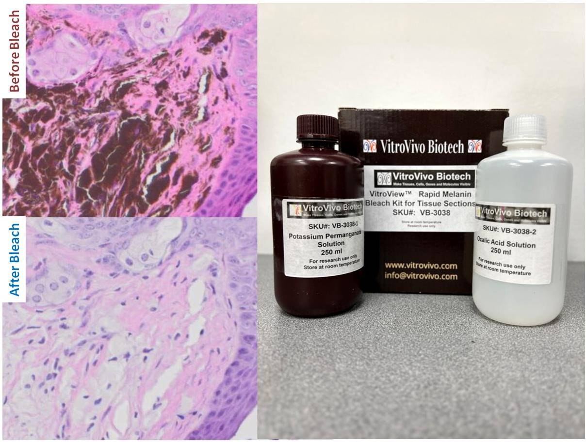 The VitroView™ Rapid Melanin Bleach Kit for Tissue Sections is designed for the selective removal of melanin pigment from tissue sections, enhancing the clarity of histological and immunohistochemical staining. Melanin, a naturally occurring pigment, can obscure cellular details and interfere with diagnostic evaluation. This kit utilizes an oxidative bleaching process involving Potassium Permanganate (KMnO₄) followed by Oxalic Acid (C₂H₂O₄) to effectively decolorize melanin while preserving tissue morphology and antigenicity.